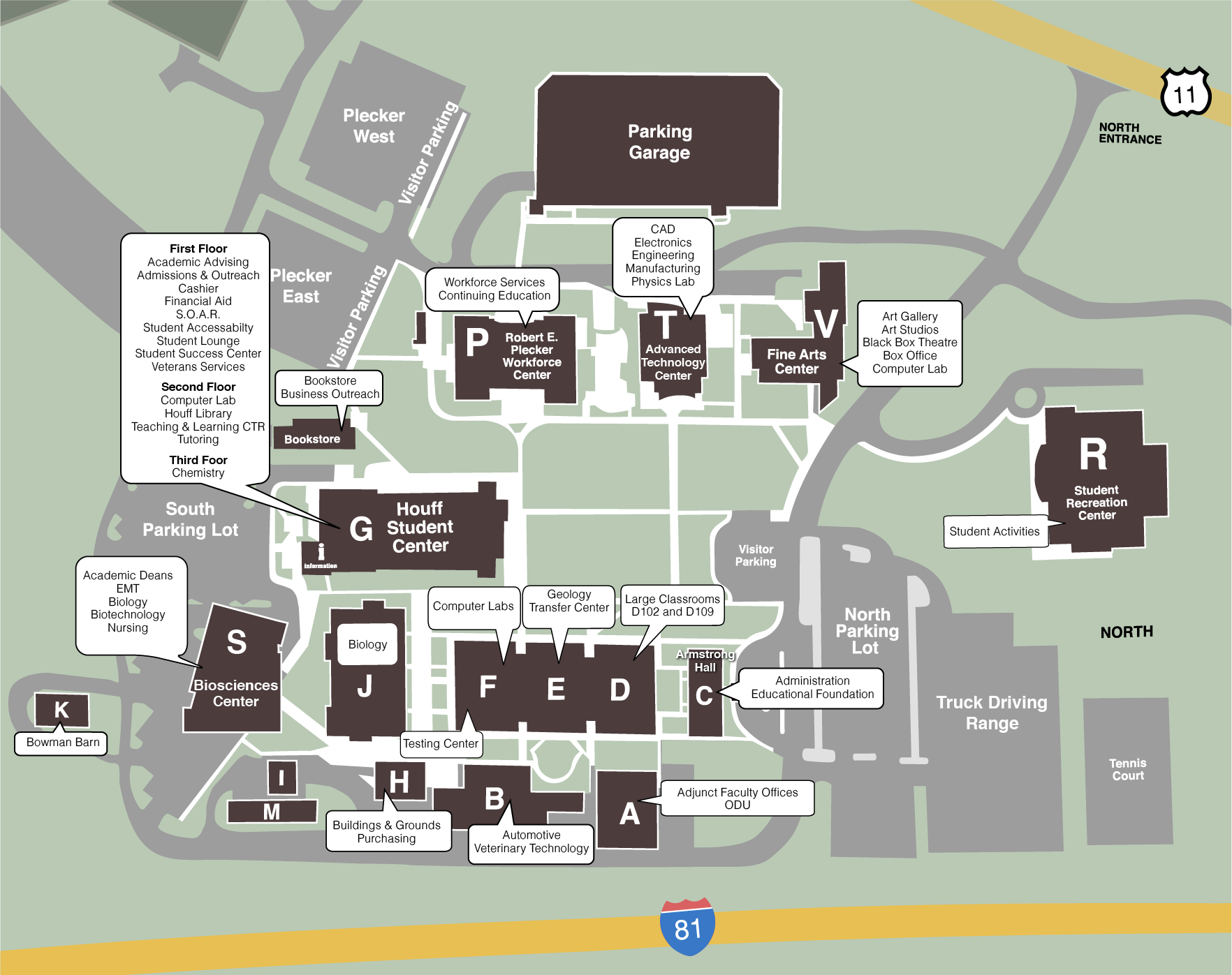 If you are going to the Houff Student Center, Building G, take the second (South) Entrance and park in the South Parking Lot.