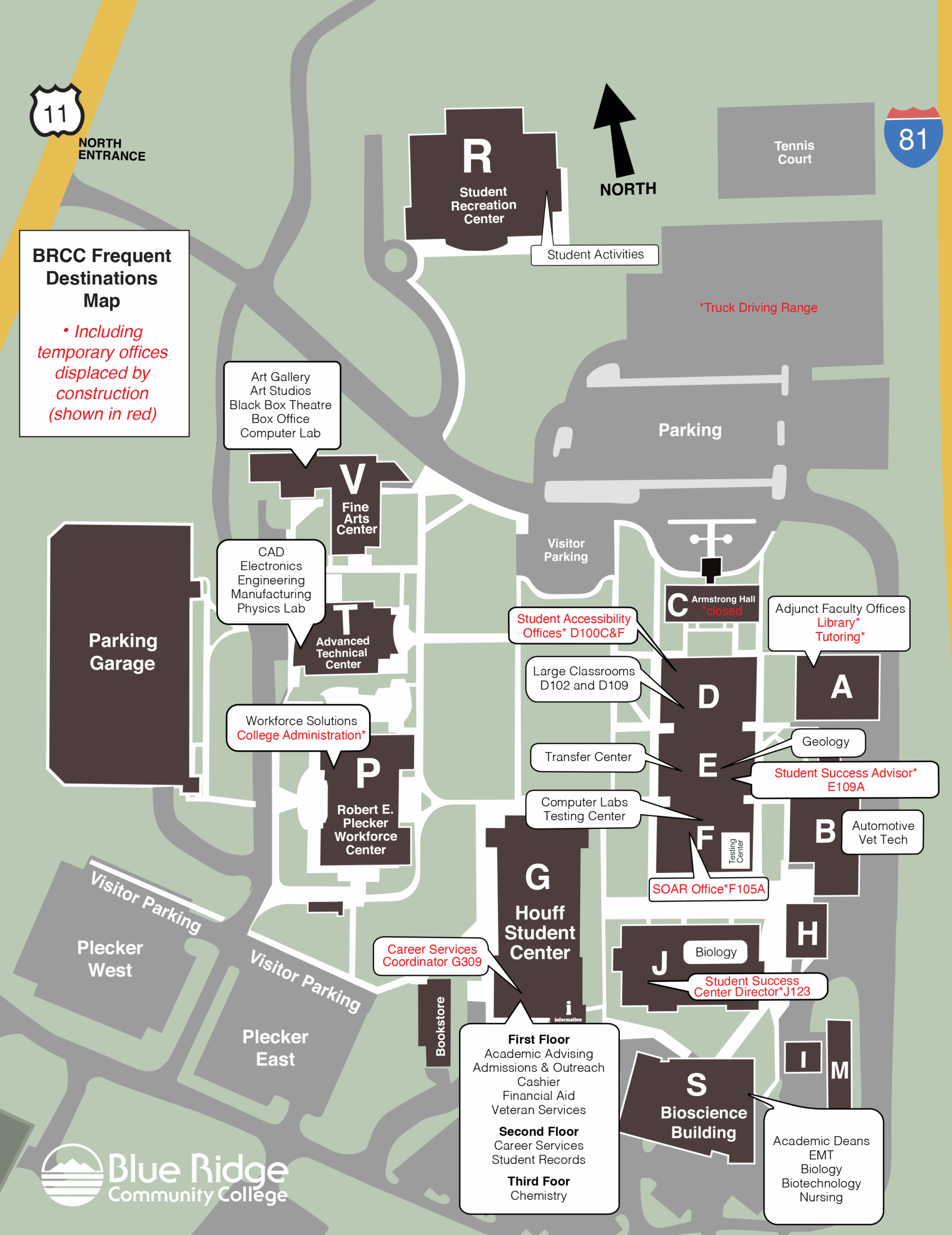 Map of campus showing buildings, parking lots, and temporary office moves due to renovation