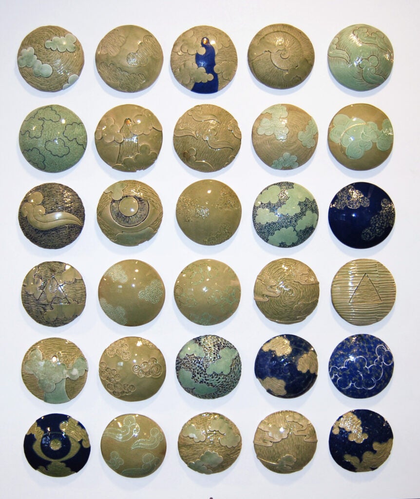 My work is made primarily of clay, with other media, such as fabric, metal, wood, and paint included when it feels logical. Surfaces include colored slip (watered-down clay), glaze (water, powdered glass, and chemical colorants), paint, sand, and other materials. Some pieces are carved and hollowed from a solid piece of clay, while others are created from slabs or coils of clay attached together. I create protrusions, carve into the surface, stencil, and otherwise alter the surfaces to add additional information and/or meaning to the works. After glazing, the pieces are fired in an electric kiln to approximately 2300 degrees Fahrenheit and then non-clay materials may be added.